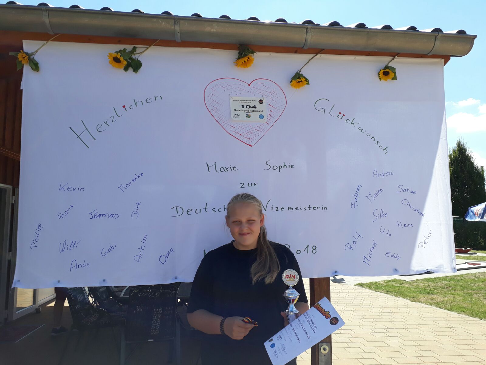 Am Sonntag wurde Marie Sophie dann auf der Minigolfanlage in der 77er Straße von den Vereinskollegen unter tosendem Beifall und Jubelgeschrei begrüßt. Auf Nachfrage gab Marie Sophie das nächste gesteckte Ziel bekannt – den Titel 2019.